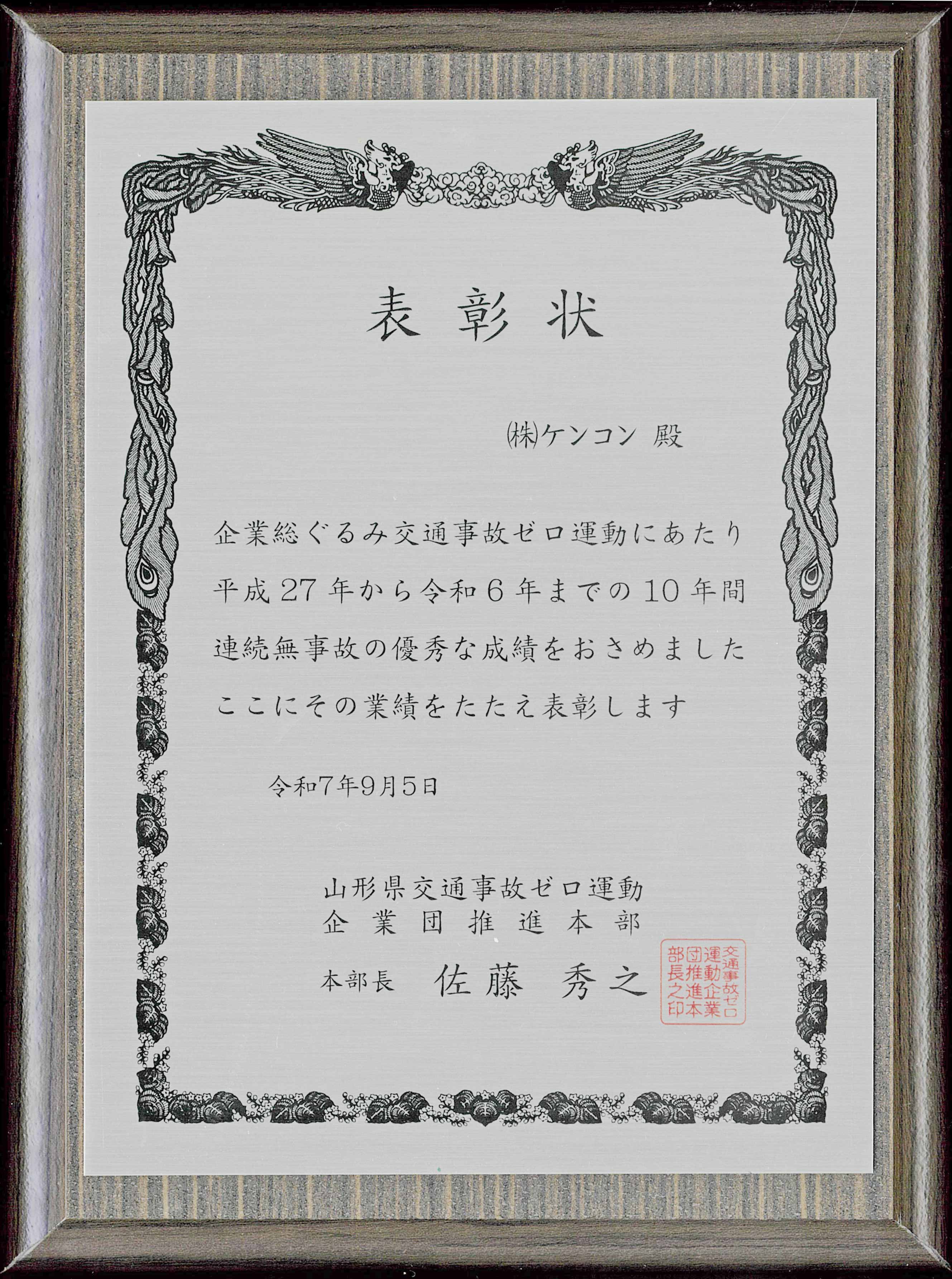 公共土木施設の利用環境の改善や安全性の向上に関し、著しい功績のあった団体及び個人に対して贈られる 令和3年度 山形県県土づくり感謝状 を県庁にて頂きました。